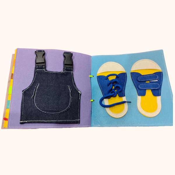 Hlačke in čevlji: Pripenjanje in vezanje za male mojstre. Na levi strani otrok spozna kavbojke z dvema klik-zaponkama, ki jih lahko odpre in zapne kot čisto prave hlačke. To uri moč prstkov, natančnost in občutek samostojnosti. Na desni strani pa ga čakata dva čevlja: en s klasičnimi vezalkami, drugi z enostavnim ježkom. Otrok lahko vadi zavezovanje, prepletanje in zapiranje, kot bi se pripravljal na sprehod. Stran spodbuja fino motoriko, potrpežljivost in občutek ponosa, ko otroku uspe “obuti” svoj par čevljev.