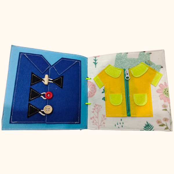 Na levi strani otrok raziskuje srajčko z različnimi zapenjanji, kjer lahko preizkusi gumbke in zaponko ter ob tem uri prstke in razvija natančnost.