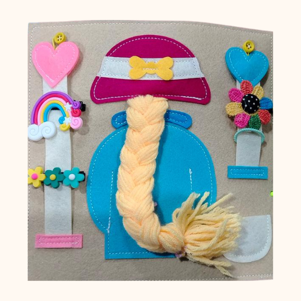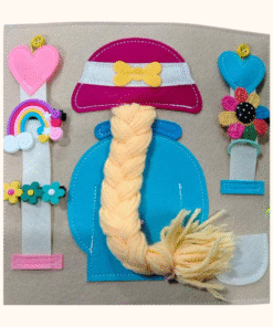 Frizurica in okraski: Pripenjanje, razpenjanje in prepletanje. Ta stran ponuja bogat nabor nalog, ki spodbujajo razvoj fine motorike, koordinacije rok in prstkov ter natančnost pri gibanju. Otrok lahko preizkuša različne načine zapenjanja (gumbi, ježek, sponke), premika in razporeja okrasne elemente ter manipulira z mehko pletenico, ki omogoča razpletanje in ponovno prepletanje. Takšne aktivnosti krepijo mišice dlani, razvijajo dvoročno koordinacijo in pomembno prispevajo k pripravi na samostojno oblačenje in kasnejše grafomotorične spretnosti. Stran spodbuja tudi ustvarjalnost, saj otrok sam izbira, kako bo elemente razporedil in kombiniral.