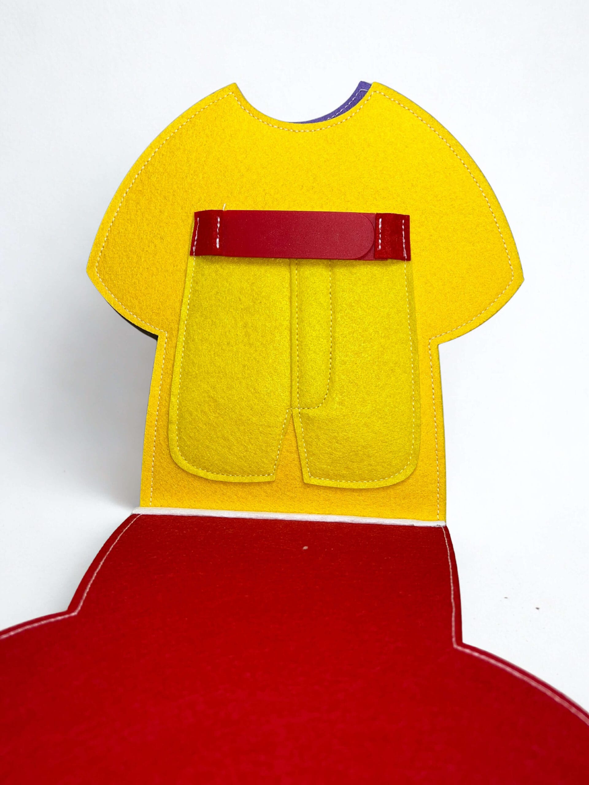 Rdeč pas s pritiskači: Tretja stran vsebuje rdeč pas z več pritiskači, ki jih otrok zapenja in odpenja. Pri tem krepi prste, razvija samostojnost in se uči, kako pritiskači delujejo.